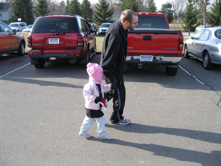 We did a 5-K race on March 27th, and Nellie "ran" the 100 yard dash. Well, Kevin kind of dragged her, but at least her feet were on the ground. She was supposed to "run" the 1/2 mile, but one appearance by Ronald McDonald and it was ALL OVER. We did follow up with playing on the playground, watching a helicopter take off, the bounce house, pancakes with Emily and Chris, so it was a good day.
